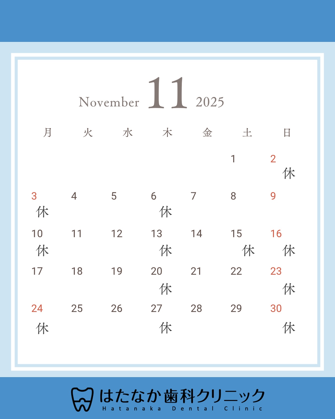 🦷【11月の診療スケジュールのお知らせ】📅 こんにちは、はたなか歯科クリニック(鐘ヶ淵)です。 だんだんと冷え込む季節になってきましたね🍂 体調だけでなく、お口の健康管理もぜひこの時期に見直してみませんか? 🦷「定期検診を忘れていた」 🦷「最近、歯ぐきが気になる」 🦷「年内に治療を終わらせたい」 そんな方は、ぜひお気軽にご相談ください✨ 🛑休診日: 11月2日(日) 11月3日(月・祝) 11月6日(木) 11月10日(月) 11月13日(木) 11月15日(土) 11月16日(日) 11月20日(木) 11月23日(日・祝) 11月24日(月・祝) 11月27日(木) 11月30日(日) ご予約の際はお間違えのないようご確認をお願いいたします。 📍当院は東武スカイツリーライン「鐘ヶ淵駅」より徒歩圏内。 地域の皆さまに寄り添う歯科医療を提供しております。 年末は混雑が予想されますので、 定期検診・クリーニング・治療をご希望の方は早めのご予約がおすすめです😊 🦷お電話またはWEB予約から受付中! 皆さまのご来院を心よりお待ちしております。 -— 📍はたなか歯科クリニック 鐘ヶ淵 〒131-0031 東京都墨田区墨田4-1-2 📞 03-3610-8241 〈HP〉https://htnk-dc.com/ 〈診療時間〉平日 :9:30-13:00 14:30-19:30      土・日:9:30-13:00 14:00-17:00 ※月曜:第2、第4休診  日曜:第2、第4診療(午後 14:00~17:00) ※祝日のある週は木曜診療 〈休診日〉第2、第4月曜・木曜・第1、第3、第5日曜・祝日 ※祝日のある週は、木曜診療 -— #はたなか歯科クリニック #鐘ヶ淵駅歯医者 #墨田区歯医者 #北千住歯医者 #東向島歯医者 #曳舟歯医者 #堀切歯医者 #定期検診 #歯の健康 #予防歯科 #歯医者さんとつながりたい #墨田区子育て #家族で通える歯医者