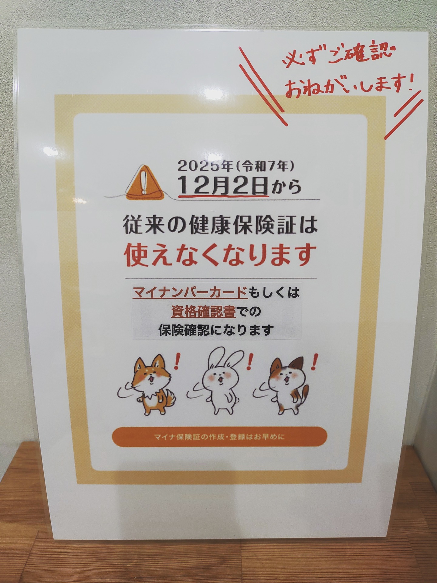 はたなか歯科クリニックです🦷 2025年12月2日より健康保険の確認方法が変わります!!    今までは『健康保険証』          ↓          ↓ これからは 『マイナンバーカード』          or       『資格確認書』             月初めの診察時に必要になります。 医療機関で従来の保険証が使えない場合がありますので、ご注意ください!!! 必ずご確認よろしくお願いいたします。 電話番号:03-3610-8241 最寄駅:東武スカイツリーライン鐘ヶ淵駅 住所:〒131-0031 東京都墨田区墨田4-1-2 診療時間 平日9:30~13:00 14:30~19:30(最終受付19:00) 土日9:30~13:00 14:00~17:00(最終受付16:30) #はたなか歯科 #鐘ヶ淵 #墨田区 #歯医者 #2025 #マイナ保険証 #インプラント学会専修医 #歯周病学会認定医 #日本糖尿病協会登録歯科医 #ホワイトニング #リップアート #Google