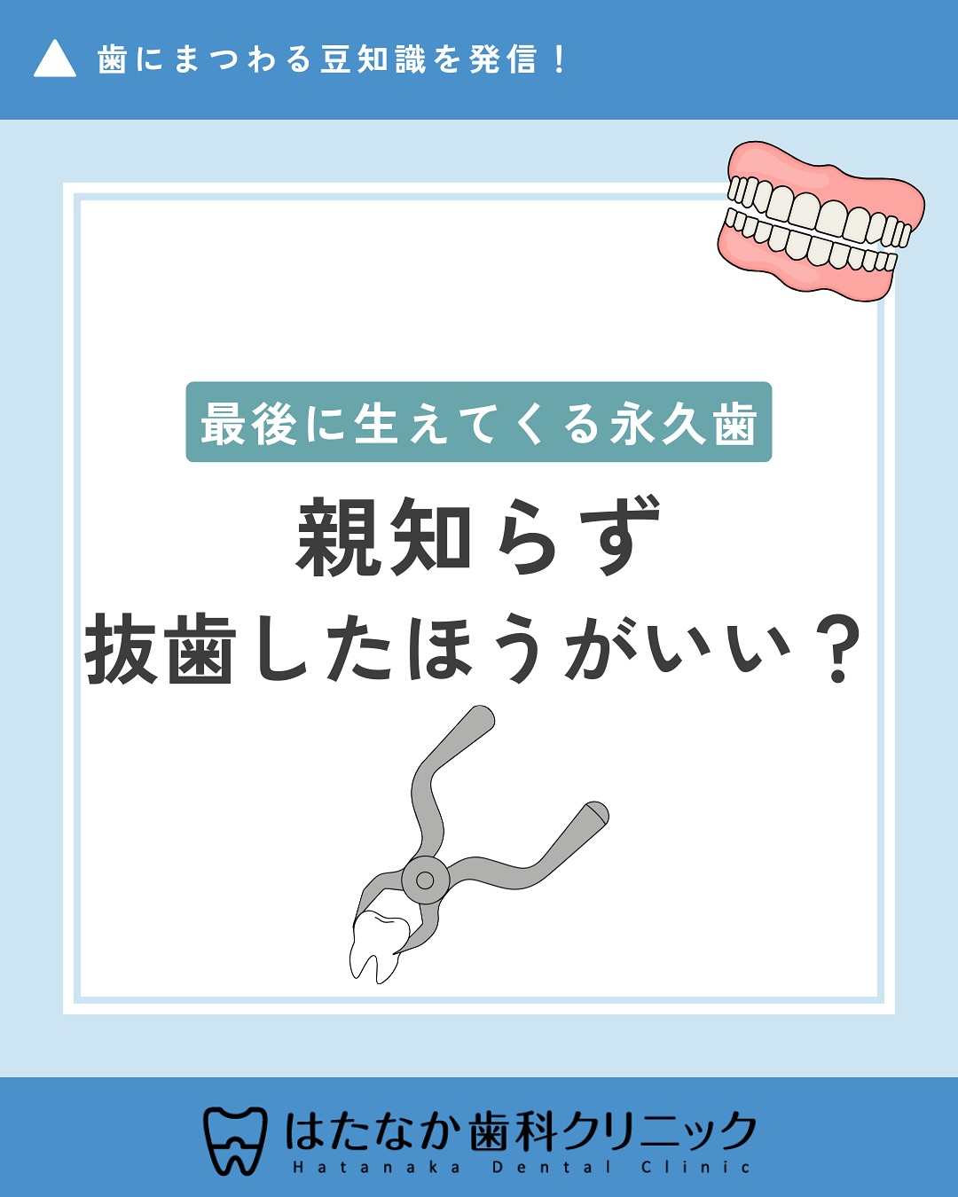 🦷【親知らず、抜歯したほうがいい?】🦷 \歯にまつわる豆知識シリーズ🪥/ 保存していつでも見返せます♪ 「親知らずって、放っておいてもいいの?」 👉実は、約8割の人が抜歯を検討したほうが良いと言われています。 📝こんな場合は要注意! ✅ 横向きや斜めに生えている ✅ 噛み合わせにずれがある ✅ 虫歯や歯周病にかかっている ✅ 埋伏歯(歯ぐきや骨に埋まっている) 放置すると、顎関節症・痛み・歯並びの悪化など、思わぬトラブルを引き起こすことも…。 気になる方は、早めに歯科医院でご相談をおすすめします✨ -— 📍はたなか歯科クリニック 鐘ヶ淵 〒131-0031 東京都墨田区墨田4-1-2 📞 03-3610-8241 〈HP〉https://htnk-dc.com/ 〈診療時間〉平日 :9:30-13:00 14:30-19:30      土・日:9:30-13:00 14:00-17:00 ※月曜:第2、第4休診  日曜:第2、第4診療(午後 14:00~17:00) ※祝日のある週は木曜診療 〈休診日〉第2、第4月曜・木曜・第1、第3、第5日曜・祝日 ※祝日のある週は、木曜診療 -— #はたなか歯科クリニック #鐘ヶ淵駅歯医者 #墨田区歯医者 #北千住歯医者 #東向島歯医者 #曳舟歯医者 #堀切歯医者 #親知らず抜歯 #親知らず痛い #親知らず腫れた #親知らずの疑問 #親知らず相談 #歯のトラブル #歯が痛い #噛み合わせ #顎関節症