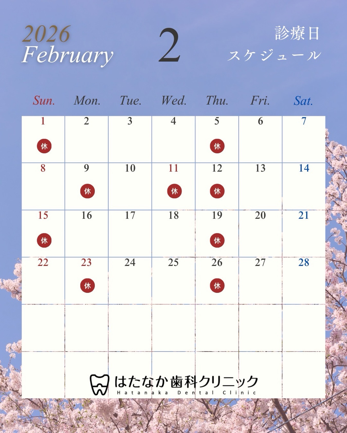 🦷 【2026年2月の診療スケジュールのお知らせ】 📅 こんにちは、はたなか歯科クリニック(鐘ヶ淵)です😊 2月は一年の中でも特に寒さが厳しく、 ✔ 歯がしみやすい ✔ 歯ぐきが腫れやすい ✔ 無意識の食いしばり・歯ぎしり といったお口のトラブルが起こりやすい季節です❄️ また、節分を過ぎると少しずつ春の気配も感じられ、 新生活に向けて「今のうちにお口のチェックをしておきたい」という方も増えてきます🌸 気になる症状がある方は、ぜひ早めにご相談ください。 📌 【2026年2月の休診日】 2月1日(日) 2月5日(木) 2月9日(月) 2月11日(水・祝) 2月12日(木) 2月15日(日) 2月19日(木) 2月23日(月・祝) 2月26日(木) ※上記以外の日程は診療を行っております ※詳細は投稿画像のカレンダーもあわせてご確認ください 当院は、 東武スカイツリーライン 「鐘ヶ淵駅」から徒歩圏内。 墨田区・鐘ヶ淵エリアの皆さまにとって、 通いやすく、安心して相談できる歯科医院を目指しています。 定期検診・クリーニングはもちろん、 「ちょっと気になるな」という段階でもお気軽にご来院ください😊 \2月も皆さまのご来院を心よりお待ちしております/ —— 📍 はたなか歯科クリニック 鐘ヶ淵 〒131-0031 東京都墨田区墨田4-1-2 🌐 https://htnk-dc.com/ 〈診療時間〉 平日:9:30〜13:00/14:30〜19:30 土・日:9:30〜13:00/14:00〜17:00 ※月曜:第2・第4休診 ※日曜:第2・第4 午後休診 ※祝日のある週は木曜も診療 —— #はたなか歯科クリニック #鐘ヶ淵歯科 #墨田区歯科 #診療日カレンダー #予防歯科