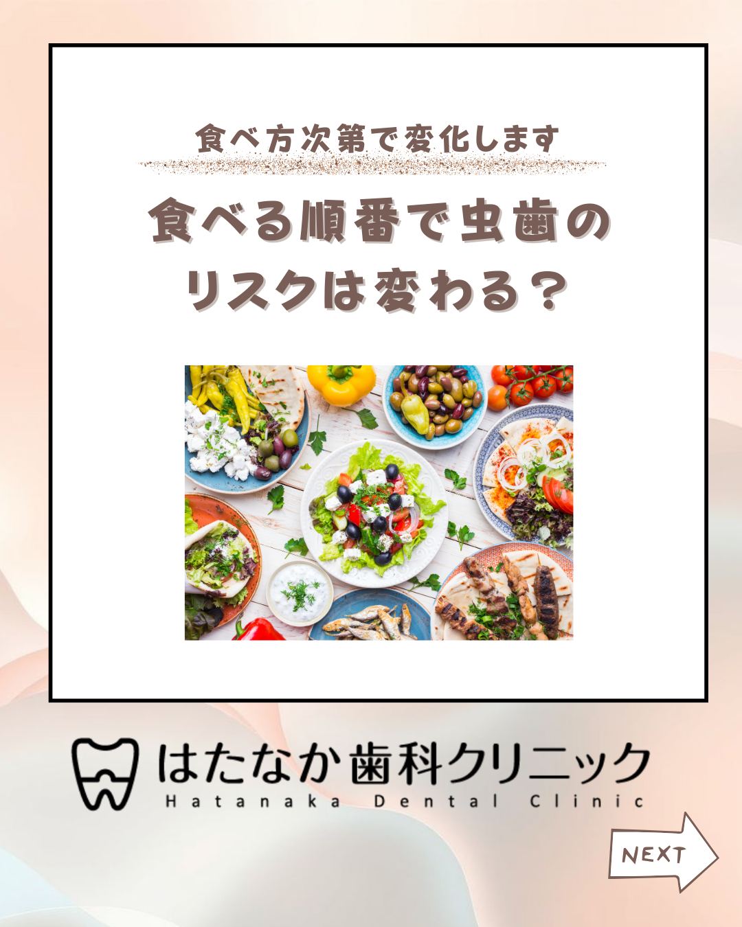 食べる順番で虫歯のリスクは変わる? 「食べる順番って本当に関係あるの?」 実は、順番は“口の中が酸性になる時間”に影響します。 つまり、同じメニューでも食べ方によって 虫歯リスクが変わることがあります。 この投稿では、歯科の視点で“良い順番・悪い順番”をわかりやすく解説します。" "① 口の中は“酸性の時間”が長いほど虫歯になりやすい 食べ物が入ると、虫歯菌が糖をエサに 👉 酸をつくる → 歯が溶けやすい状態(酸性)に この酸性状態から元のpHに戻るまで、30分~2時間かかります。 つまり👇 食べる順番によって「酸性の時間」が長くなる=虫歯リスクが上がる。 甘いものだけではなく、 ・パン ・ジュース ・フルーツ など“糖の多い食品”も同じように影響します。" "② 虫歯リスクが上がる順番 / 下がる順番 ❌ リスクが高い順番 1)甘いもの(デザート)をたびたび口に入れる 2)食事 → 甘いもの → だらだら飲食 3)ジュース・カフェラテをちびちび飲む → 酸性の時間がどんどん延びるため、歯に負担が続きます。 ⸻ 🟢 リスクを下げる順番 1)食事 → デザートの“一回”で終わらせる 2)甘いものの前に食物繊維の多い食材(野菜) 3)水やお茶で口の中をリセット 4)間食は“回数”を減らすのが最重要 ポイントは だらだら食べない・糖が口に触れている時間を短くすること。" "③ 結論:順番より“時間”が大事 同じものを食べても、 “口の中が酸性になっている時間”が短いほど虫歯は減ります。 そのための簡単なコツ👇 ・甘いものは食事の直後にまとめる ・だらだら食べをしない ・水やお茶で流す ・酸性食品の後はすぐに磨かず、しばらく置く 🟢 「何を食べるか」より「どう食べるか」が歯を守ります。 今日からできる範囲で、やれるところだけ変えてみてください。 #予防歯科 #はたなか歯科クリニック鐘ヶ淵 #歯の健康習慣 #やわらかい食事に