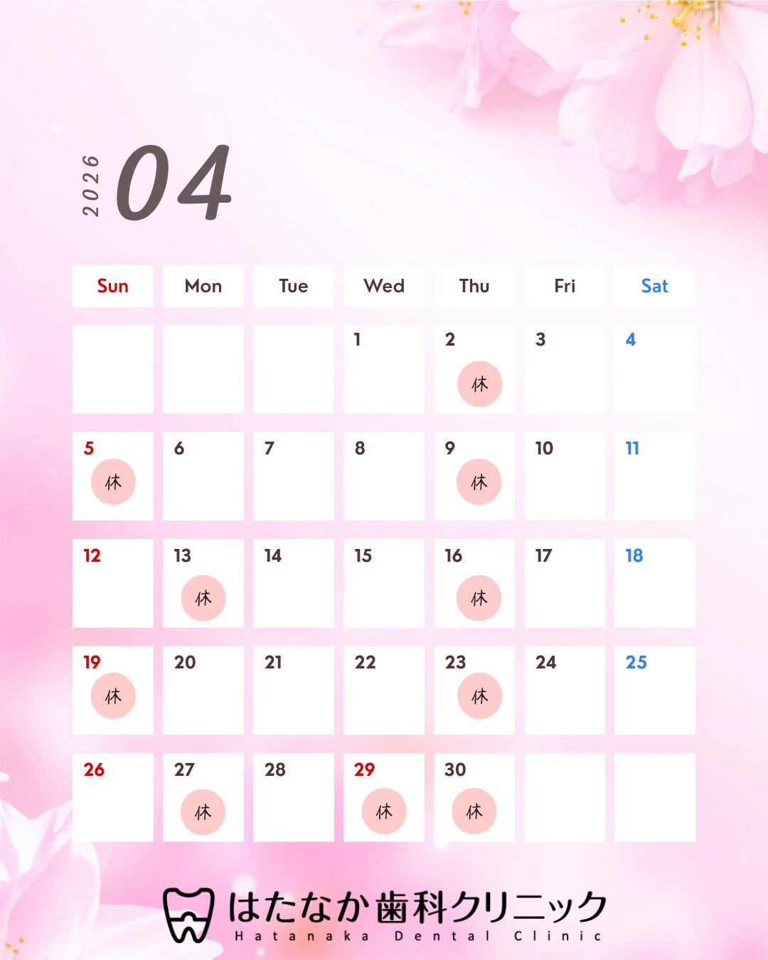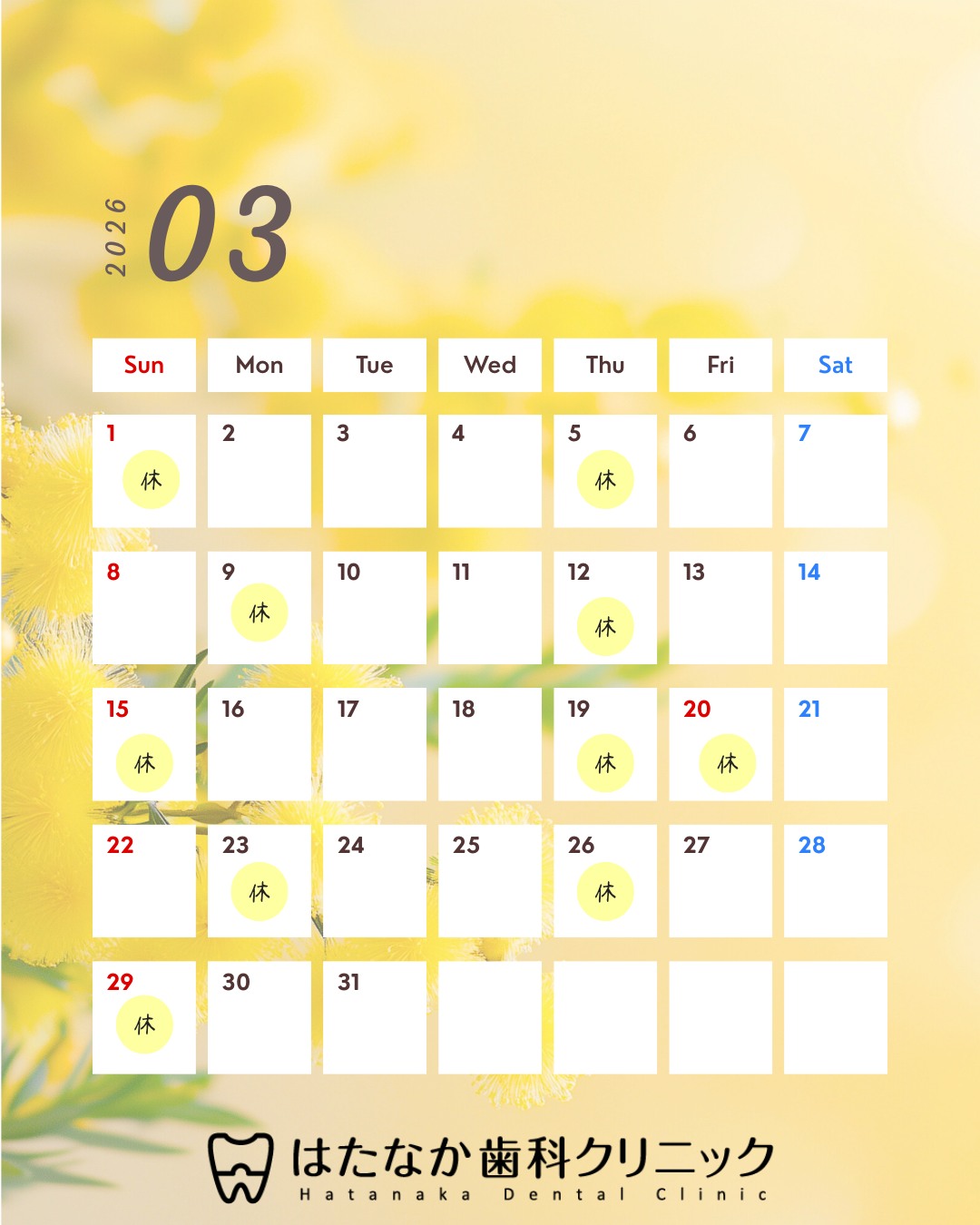 こんにちは、はたなか歯科クリニックです🦷🌼 少しずつ春の気配を感じる3月。 新生活やイベント前に、お口のケアを整えておきませんか? 3月の休診日をお知らせいたします📅 定期検診やクリーニング、 気になる症状のご相談もお気軽にご予約ください。 「最近歯医者に行けていない」 「年度替わり前に診てもらいたい」 そんな方もぜひこの機会に✨ ご予約はお電話またはHPより承っております。 📍はたなか歯科クリニック 東京都墨田区墨田4-1-2 TEL 03-3610-8241 #はたなか歯科クリニック #墨田区歯医者 #墨田区歯科 #歯科検診 #クリーニング