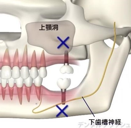 下顎の場合、下槽管という太い神経や血管がある部位があります。インプラント手術時、神経や血管を傷つけてしまい、神経麻痺などが起きるリスクがあります。