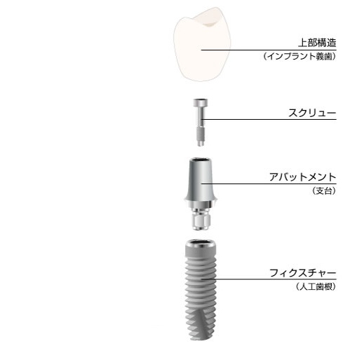 インプラントは、インプラント体のチタンと骨が結合する(オッセオインテグレーション)ことでしっかりと噛める様になります。